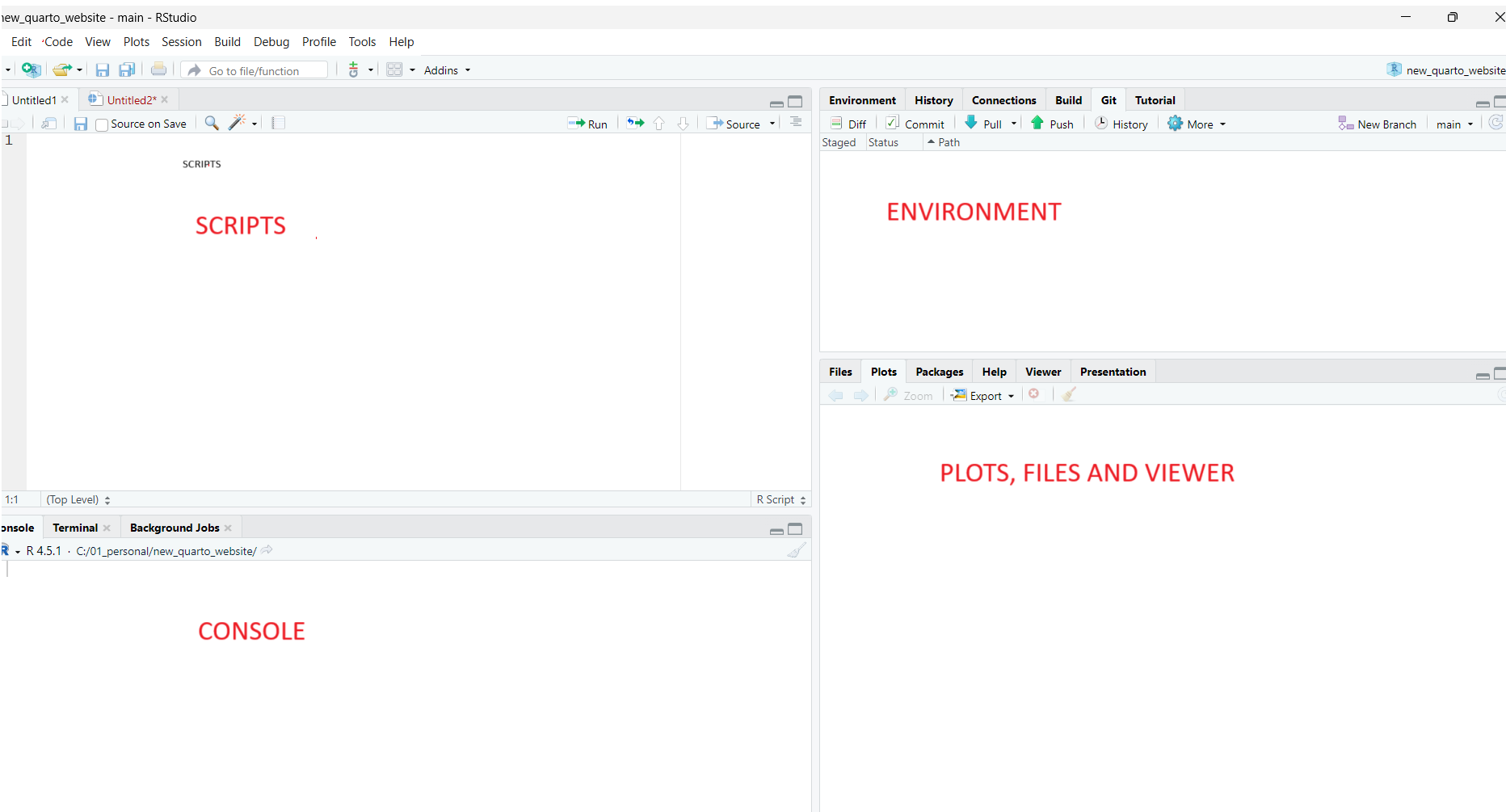 For the beginner level just be aware that code you run is displayed in the console. Many outputs, errors etc can be seen in the console panel. We do NOT normally type inside the console on a day to day basis. There are a few use cases where one would type into the console but this is not the normal. Usually typing is done in the scripting window and not the console. More advanced users may also access the terminal from this window. We will look at this in further modules.
